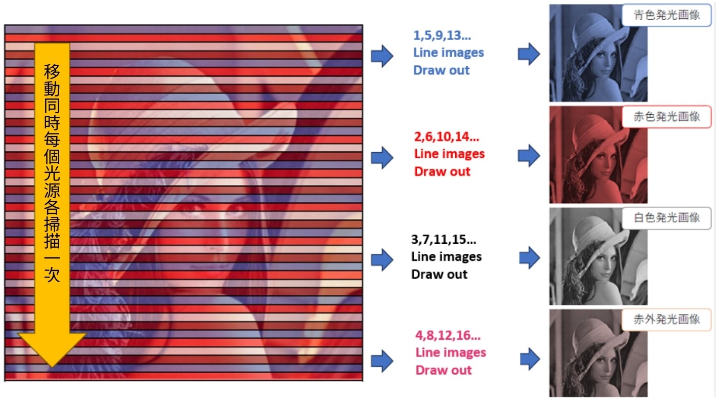 在單一取像站位中,以一台 Line Scan 相機搭配多組光源,透過分時觸發的方式,在同一掃描流程內取得多波長/多角度影像,再將影像分解重建為各光源通道的圖像,供後續演算法判讀。藉由把多站能力整合到單站系統中,不僅能保留多通道成像的優勢,也能有效降低初期投資、簡化設備配置,並提升後續維護與擴充的便利性。